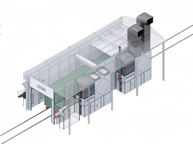Окрасочно-сушильная камера проходного типа уличного исполнения SPK-SCB(0)-9.5.5 предназначена для подготовки изделий к покраске, нанесения на них лакокрасочных покрытий и их сушки при повышенной температуре. В камере обеспечивается равномерный поток очищенного, подогретого воздуха. Направление потока воздуха - сверху вниз камеры. Камера имеет сухой способ фильтрации воздуха от остатков краски. Это обеспечивает наилучшее нанесение лакокрасочного материала на подготовленное изделие и не требует реализации дополнительных очистных сооружений.